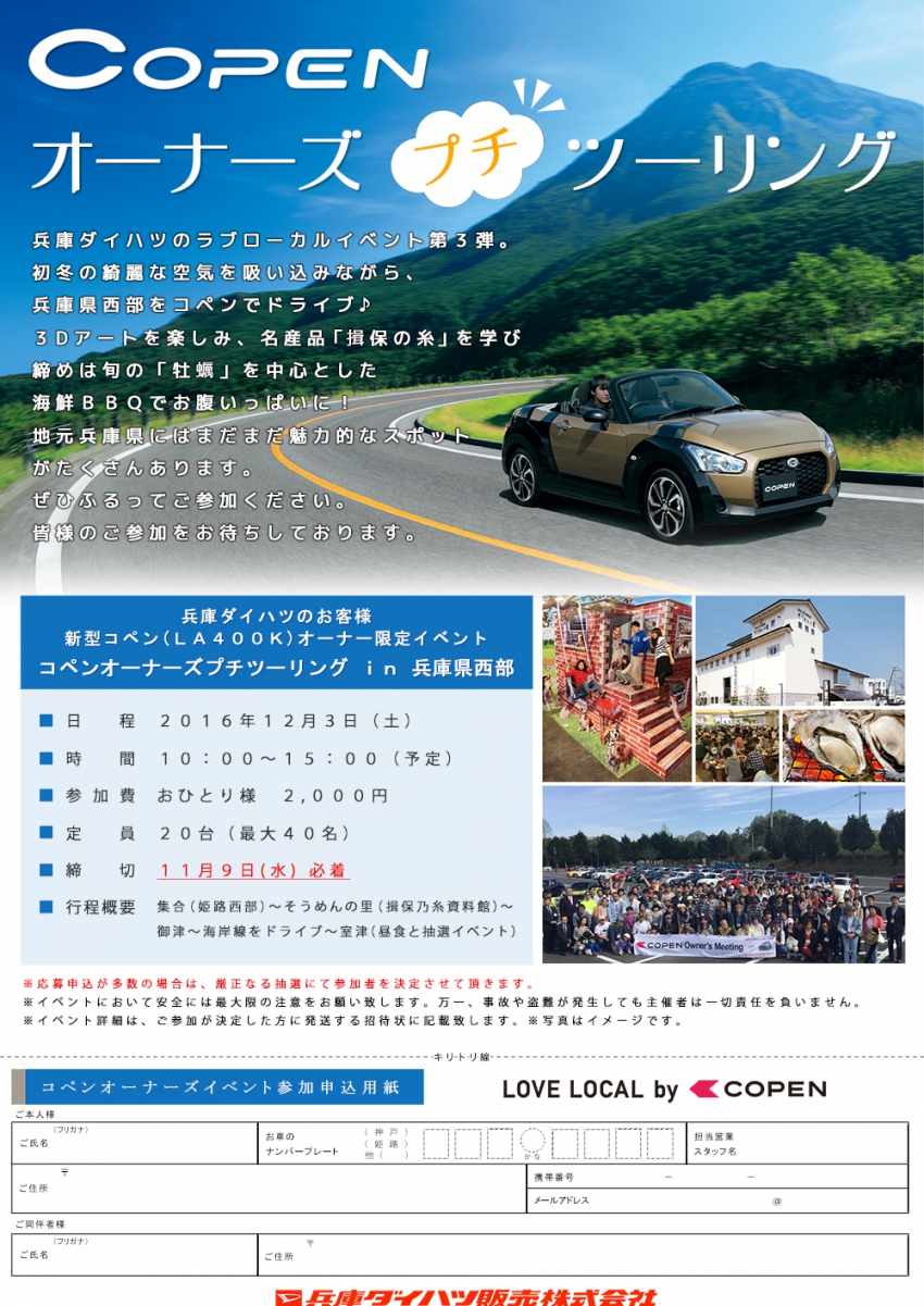 みなさんこんにちは!来る12月3日に当社ラブローカルイベント第3弾を開催します!内容は兵庫県西部のプチツーリングです。途中経由地を経て最後には海鮮BBQの予定です!